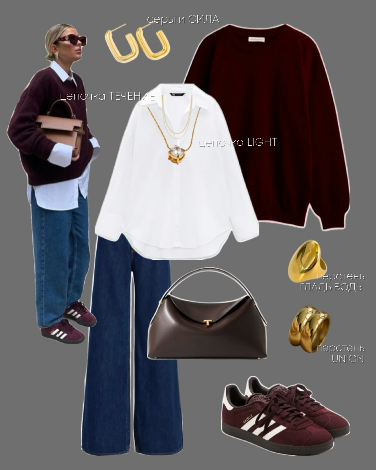 каталоге. Образ: свободный свитер, белая рубашка, кроссовки и деним — гармония между комфортом и стилем.