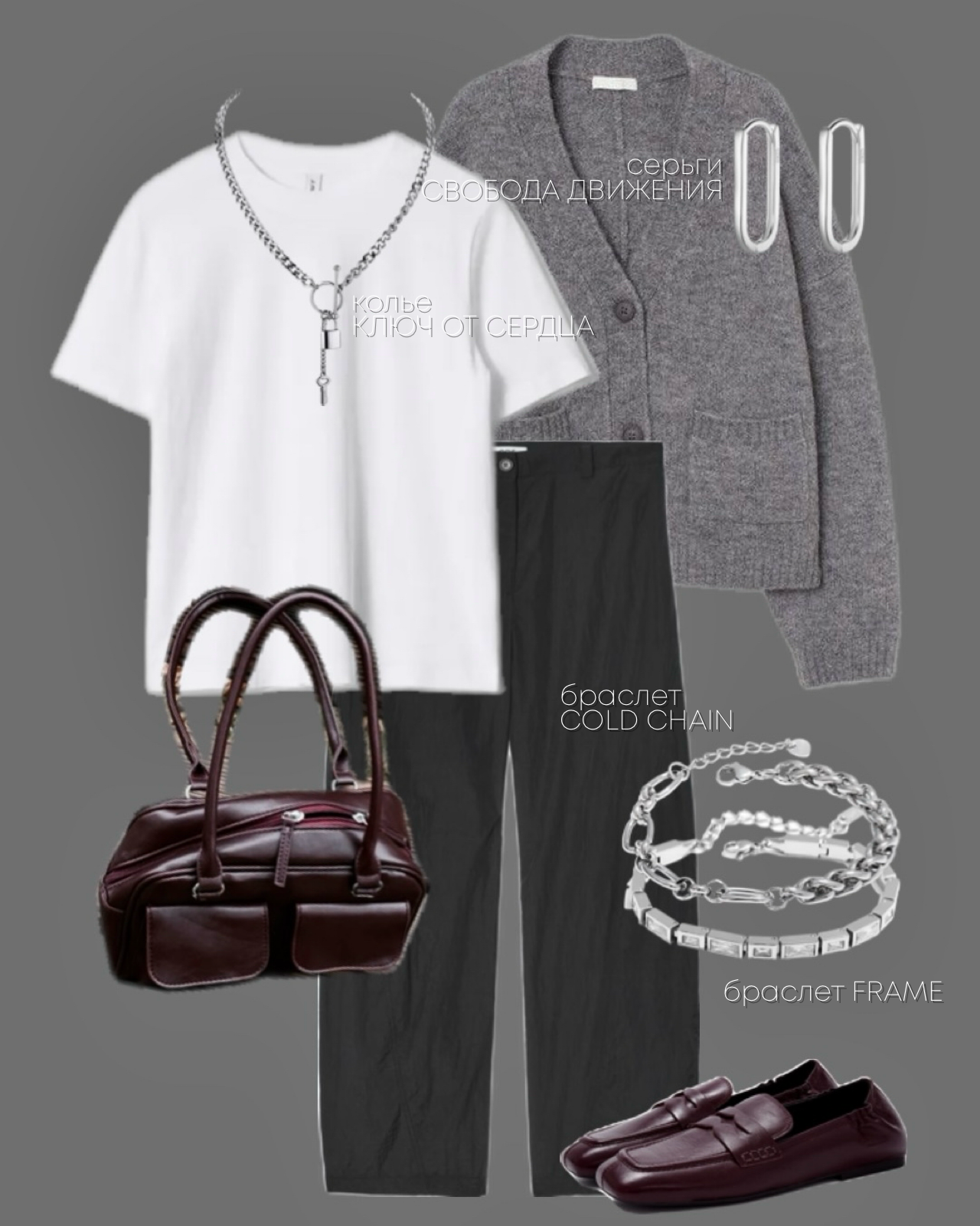 Образ: базовая белая футболка, мягкий кардиган, лаконичная геометрия в деталях.