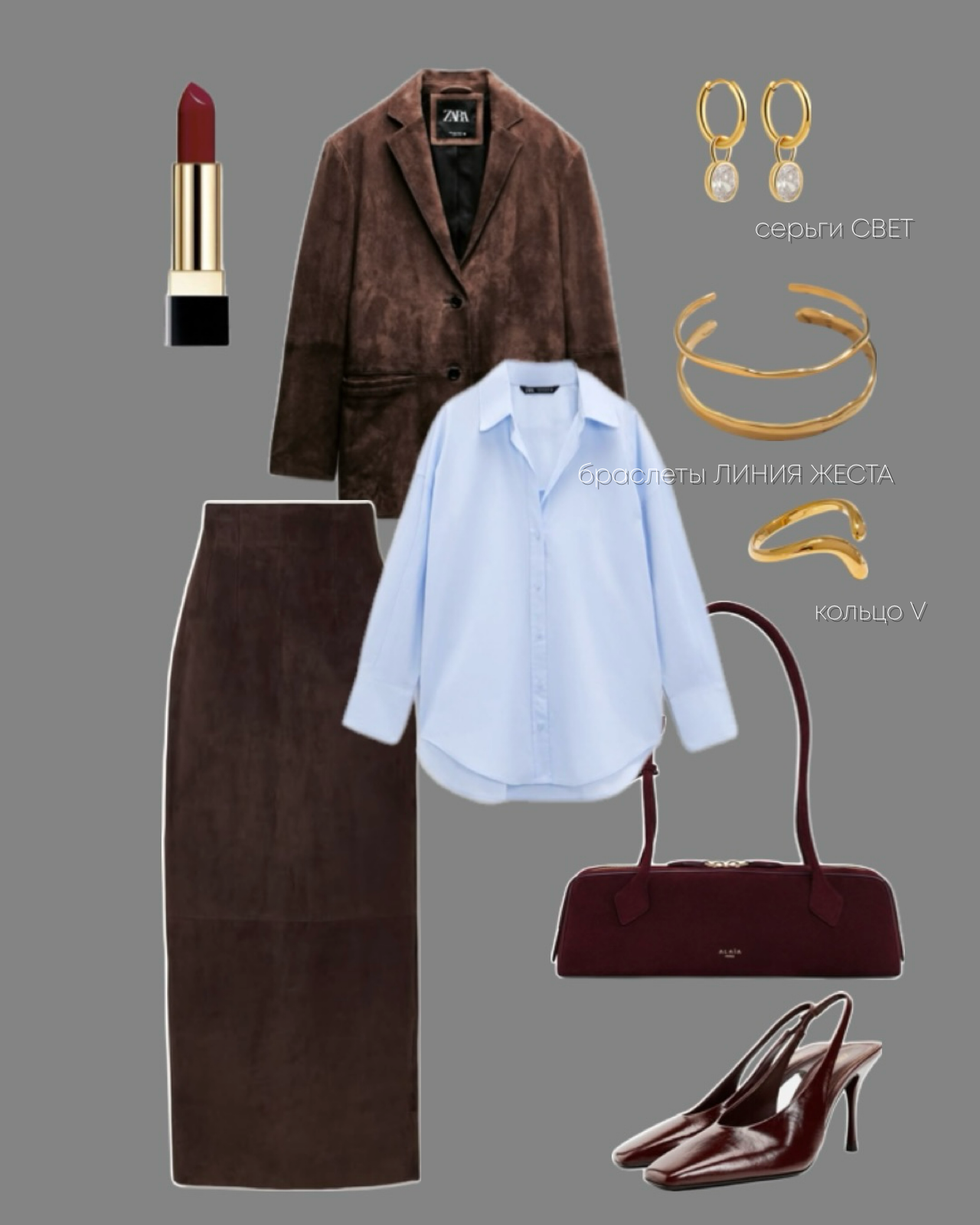 Образ: светло-голубая рубашка и коричневый костюм — сочетание уверенности и мягкости.