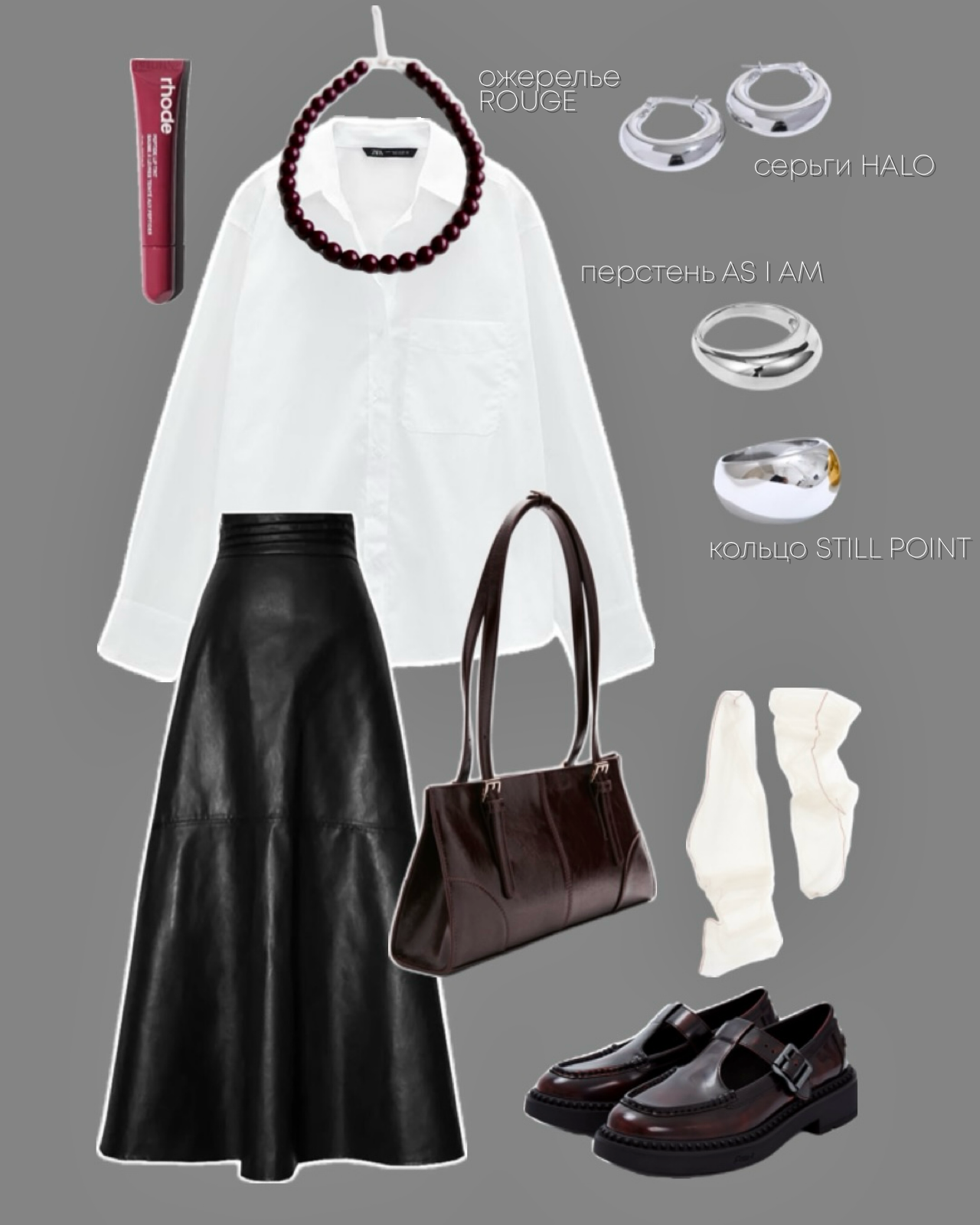 Образ: белая рубашка и кожаная юбка — классика, которая не требует слов.